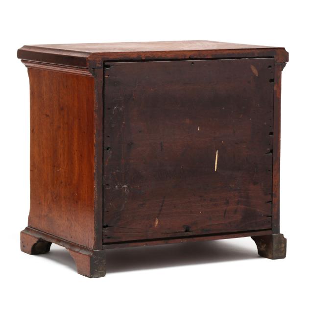 19th century, white pine and poplar secondary, top with molded edge, six recessed small drawers (bottom left with interior dividers), shaped bracket foot base.