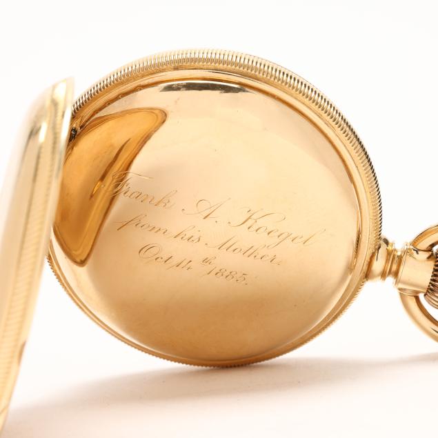 Circa 1884, stem wind and lever set, serial number 2505409, with fifteen jeweled movement, grade P.S. Bartlett, the hunter case with engine turned detailing and coin edge, the signed white dial with Roman numeral hour markers, blued steel spade hands, and subsidiary seconds dial at the 6:00 hour, the movement engraved 2505409 / Waltham Watch Co. / WALTHAM, MASS., case stamped AW CO / A4772 / 18K, the cuvette engraved Frank A. Koegel / from his Mother. / Oct 14th 1885.