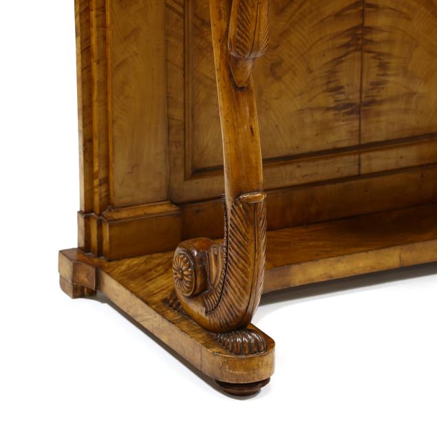 Circa 1830-40, maple and flame satin wood veneer, rectangular form with later marble top, veneered skirt, the table supported by two relief carved stylized swan necks terminating with scrolled rosette, rear panel with applied molded picture frame, cut and recessed base board with conforming support base.