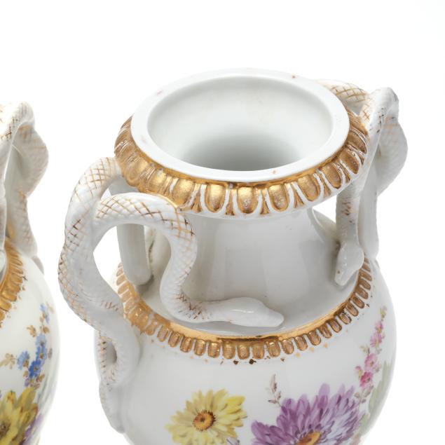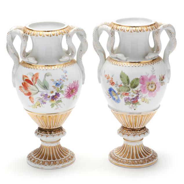 Late 19th century, having white grounds with floral sprays painted to each side, the upper shoulders support twisted snake handles, gilt accents, underglaze crossed swords on the undersides as well as impressed numbers 139 and 153.