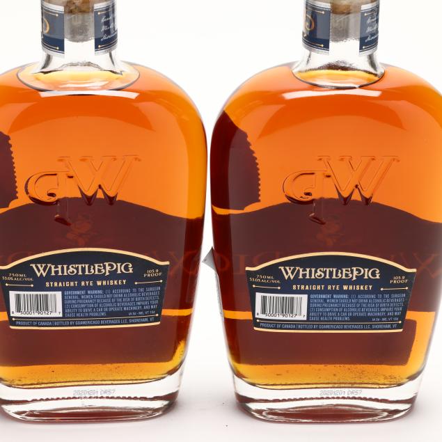 NV, WhistlePig Estate Oak Rye, Single Barrel, 15 Years Old, Shoreham, Vermont, 53%, exclusive bottling for Bourbon Street W&S from barrel #1438, bottles 51 & 121/136, 1vts, 1ts, 2 sealed glass decanter bottles (2 750 ml)
