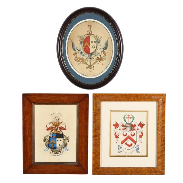Arms of Christian Impaling Mellor, circa the 1850s, retaining typed history to verso, featuring the motto "Perseverando / Salus Per Christum"; the Heape family coat of arms, late 19th century; and a coat of arms featuring the motto "Honesty, Temperance, Chastity", first half of the 19th century, featuring a castle and two white eagles; all in various frames under glass.
