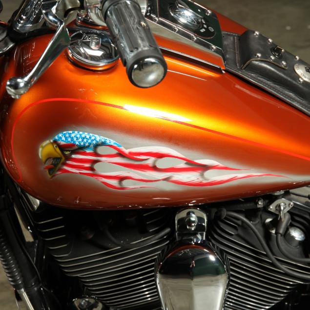 A custom paint job with lots of chrome, and a low banana style seat. Cruise control is added.
