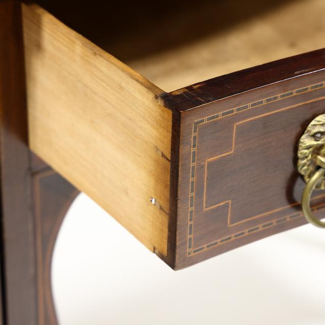 Early 20th century, serpentine top with banded light and dark wood line inlay, brass gallery, central drawer flanked by two hinged cabinet doors all with banded line inlays, straight tapered legs with spade feet featuring line inlays.
