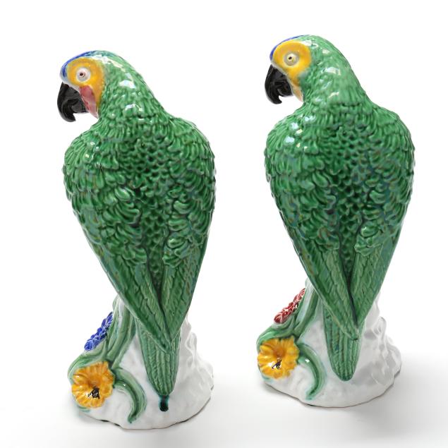 Made in Portugal, 20th century, the colorfully glazed birds are modeled perched upon a branch from a rocky outcrop, paper label to the underside.