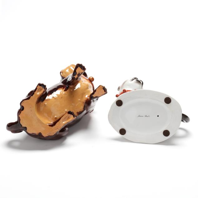To include: a standing pair with black faces attributed to Victoria Carlsbad (6 1/4 x 5 1/2 in.), a large brown seated dog with impress "Made in Portugal" (8 1/2 in.), a dog on a cushion marked "Jeanne Reed's" (7 1/2 in.), an unmarked seated dog with black face (restored rear foot and backside around tail), (6) six pugs of porcelain or bisque, unidentified makers.
