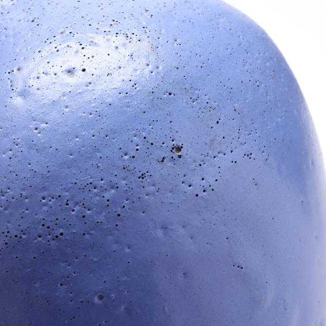 1950s, matte blue glaze, bulbous tapered form with flared foot, integral applied loop and ring handles, not marked.