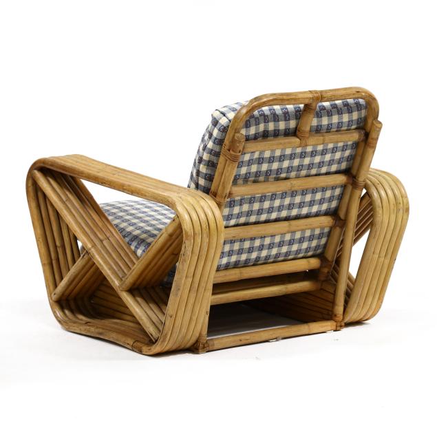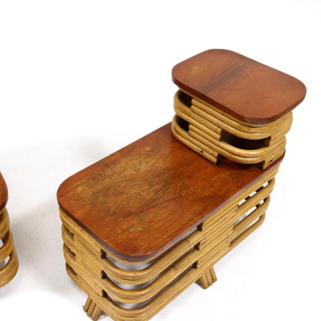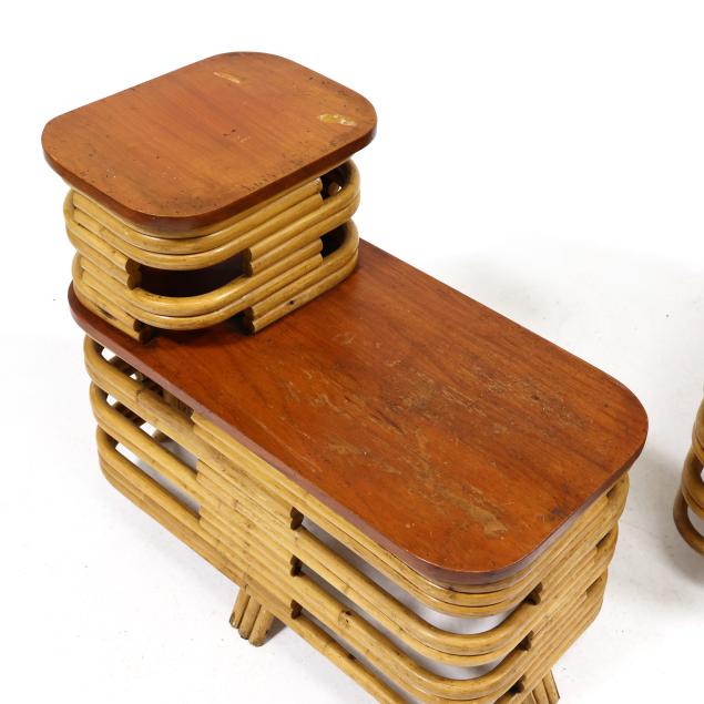 1950s, including a triple seat sofa (32 x 99 x 30 in.); a club chair (31 x 33.5 x 32 in.); ottoman (14 x 22 x 22 in.); and pair of step side tables (26 x 15.5 x 30 in.), unmarked.