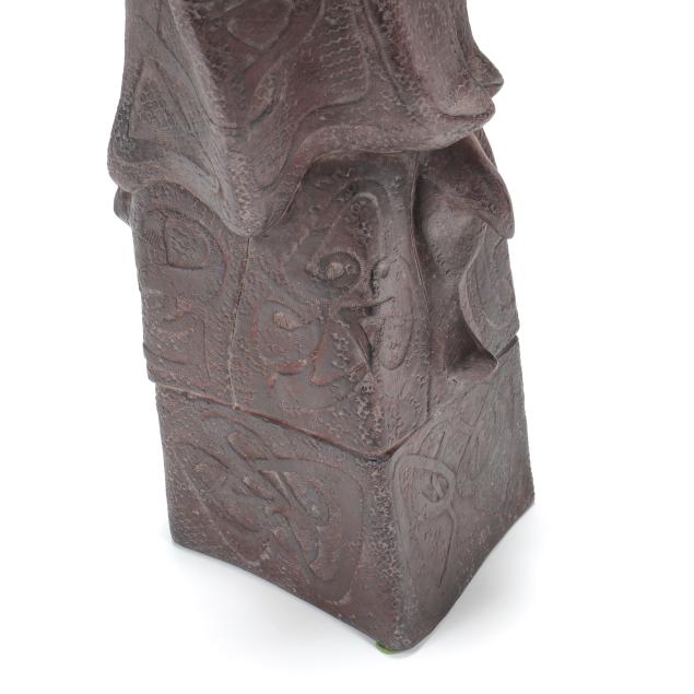 1993, painted ceramic, abstract totemic form with scale texture and bas relief arabesques, artist signed and dated near the base.