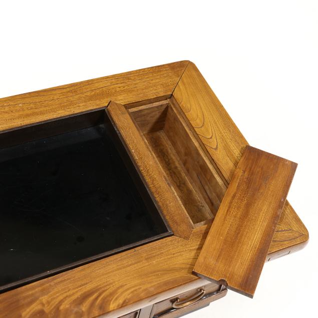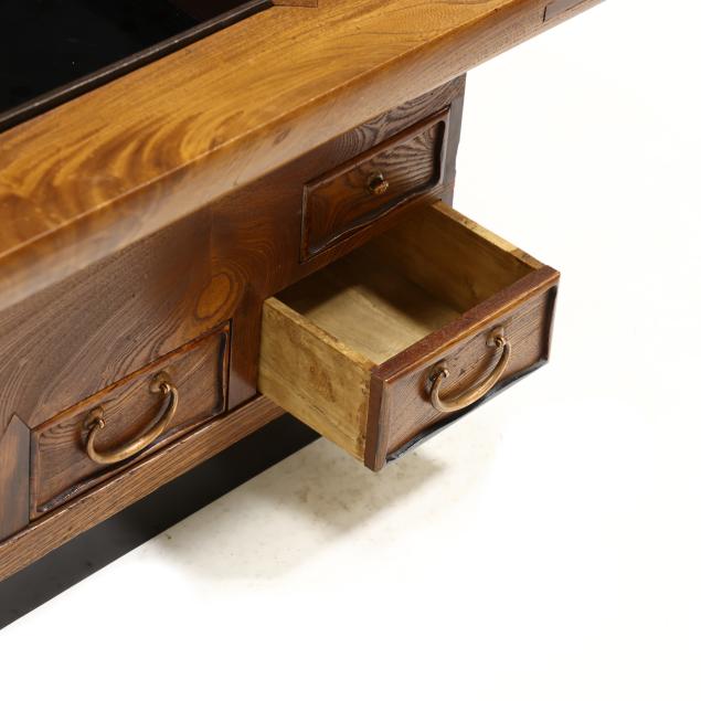 Circa 1900, rectangular dovetailed cabinet form in elm wood, three drawers with copper pulls, sides with shaped handles, molded base, unmarked.