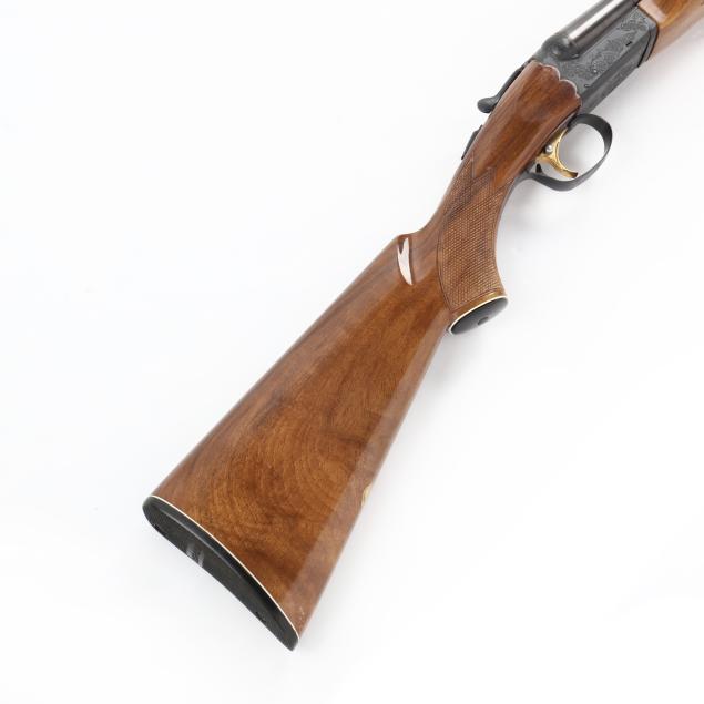 Serial number R254429 on watertable, barrel flat and forend metal, 25 in. blued barrels marked MODEL 200E - 20 GA- 3 CHAMBER - PROOF TESTED / ITHACA GUN CO. INC. ITHACA N.Y. MADE IN JAPAN- ROTO FORGED / CUSTOM CRAFTED FOR ITHACA BY SKB with single red hi-vis front sight and mid bead sight, barrels choked MOD and IMP, shell ejectors, blued receiver with decorative scrollwork engravings, checkered walnut stock and beavertail forend with original ITHACA-SKB buttplate.