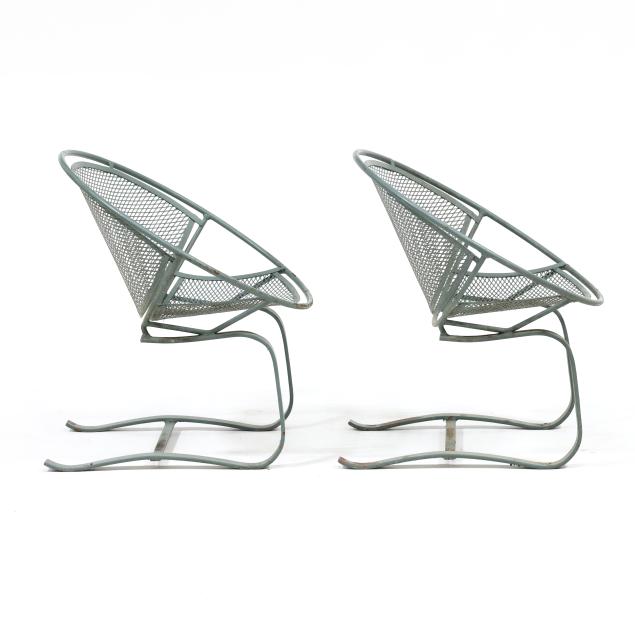 Circa 1950, for Salterini, green painted iron, including a pair of cantilevered chairs and one chair with circular drink's table attachment, unmarked.