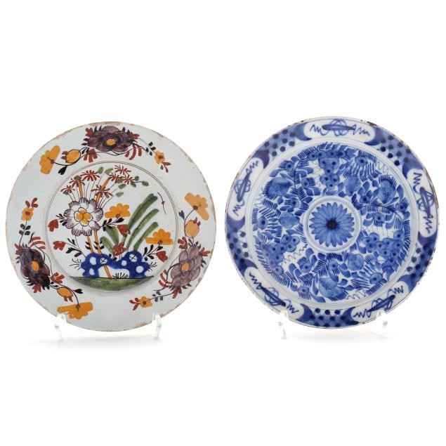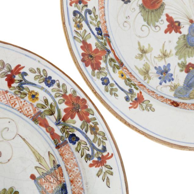 18th-early 19th century, a well matched pair of blue and white floral pates with ecru rims (some edge chips and restoration); a well-matched pair of polychrome floral plates (allover crazing); (2) other plates one blue and white and one polychrome (typical edge fritting).