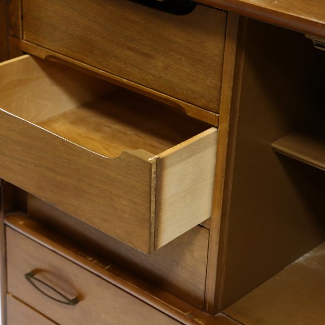 Circa 1960, walnut veneer, the chifferobe with two hinged double paneled doors with divided interior having three fitted drawers to the left and a single shelf to the right, over two drawers, shaped tapered legs (45 x 40 x 19 in.); the matching dresser with a hinged paneled door to the left with fitted drawers to the interior, the case with eight flush drawers raised on tapered legs (32 x 72 x 19 in.).