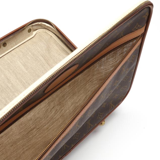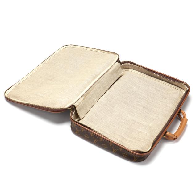 Attributed to The French Company 1980, a sophisticated means of transporting essential documents and laptop, with two exterior pockets to help organize. Composed of monogram canvas and tan cowhide, it features a 3/4 zipper, a leather patch for the owner's monogram, protective bottom feet, an open interior, and marked 'CC' zipper pulls.