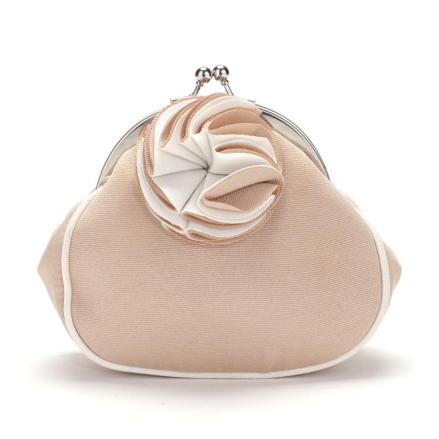Made in Italy, neutral two tone fabric with a silver tone frame and kiss lock top closure, satin lined interior has a leather Valentino patch upon a small pocket, tuck-away silvertone chain. A clear plastic Valentino drawstring bag is included.