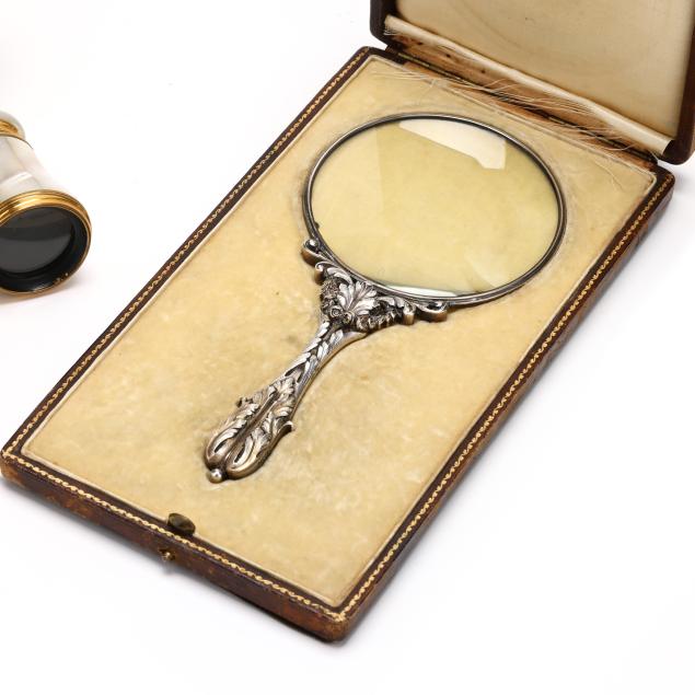 Late 19th-early 20th century, the first a sterling mounted magnifying lens, the handle marked "Sterling France" along with French hallmarks, presented in a fitted leather retailer case with mark of "Spaulding & Co. / Chicago-Paris" (1 x 4 1/2 x 8 1/2 in.); together with a pair of Parisian mother of pearl and ormolu opera glass, marked "LEMAIRE FT / PARIS", within a leather fitted case, interior marked "E L Metcalf" (3 x 4 1/2 x 2 in.).