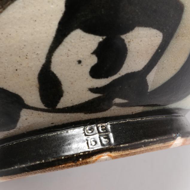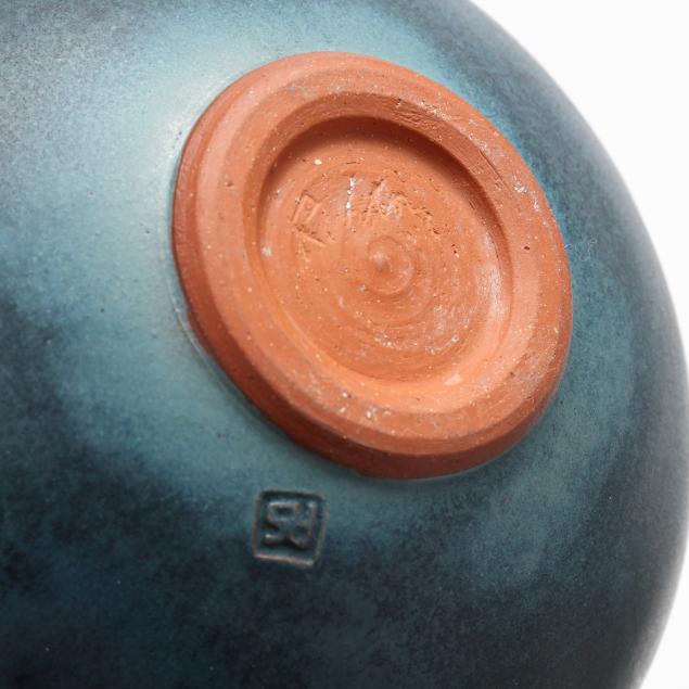 The first, a Terry Gess (Bakersville, NC), studio art pottery bowl with black and white spiral slip, signed and marked (6 1/4 x 11 1/4 in. dia.); the second, a contemporary vessel with black and white crackle decoration to the exterior, unsigned (9 x 6 1/2 in. dia.); and a studio art pottery ovoid vessel with cobalt glaze, marked "RS" and signed for an unidentified maker (6 1/2 x 8 in. dia.).