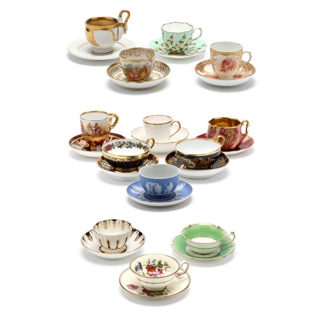 (13) matched sets, each a unique pattern by various makers including Wedgwood, Coalport, KPM, Royal Crown Derby, Limoges, and others, all but one set marked.
