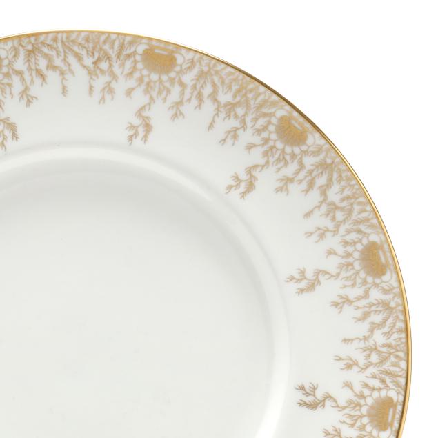 England, late 20th century, (60) piece set, service for twelve, white bone china with gilt shell and foliate motif, to include: (12) dinner plates (10 3/4 in.); (12) salad plates (7 1/2 in.); (12) bread and butter plates (5 7/8 in.); (12) footed cups (2 3/4 in.) and (12) saucers (5 7/8 in.). All with company backstamp.