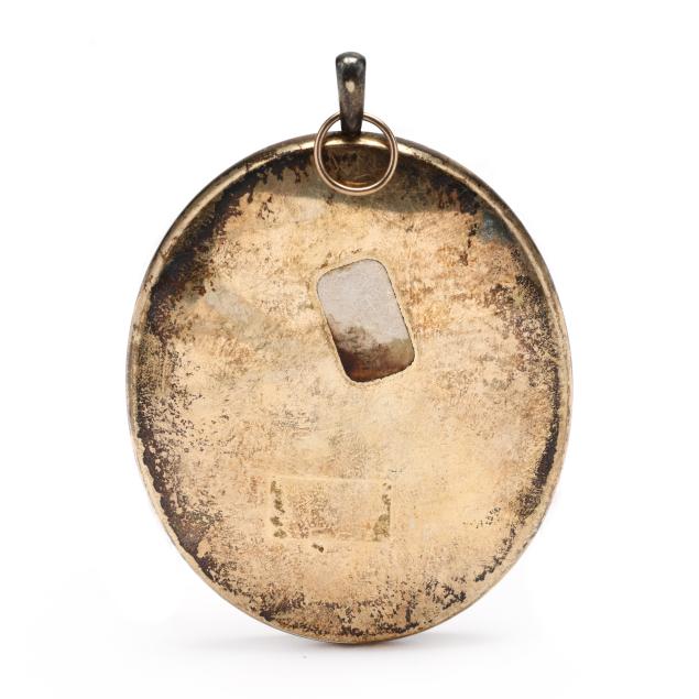 Early 19th century, watercolor on ivory, signed T.H. to the lower right, possibly by the hand of Thomas Hazlehurst (c. 1740-c.1821), the handsome gent with blue eyes and blue coat, white waistcoat with high collar and tied cravat, and presented in a period silver gilt pendant.