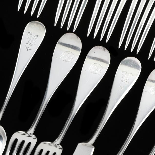 Includes a set of (12) coin silver forks by Farrington & Hunnewell, Boston and Lowell, Massachusetts, circa 1836-1881, plain tipt ends, (7 1/2 in.); and (3) pieces of sterling silver flatware by Alexander Stowell & Co., Boston, Massachusetts, circa 1865-1904, a pair of place spoons with a plain rounded handle dated 1885 to the verso (7 1/4 in.); and a butter spreader with a plain tipt end (7 3/4 in.); all pieces monogrammed.