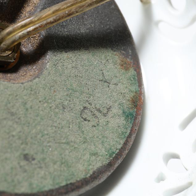 Hungary, late 20th century, single socket fixture, white vase basketweave lamp with gilt trim (6961) set atop a reticulated stand (6903), both with company backstamps, includes shade.