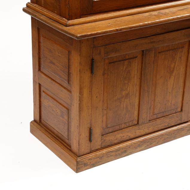 Early 20th century, attributed to Randolph County, North Carolina, two part form, upper and lower case each with double raised panel, pronounced applied cove molded cornice, two large upper hinged doors, each with two glass window panes, divided and shelved interior, the base with two hinged cabinet doors each with double raised panel, open interior, flush paneled base.