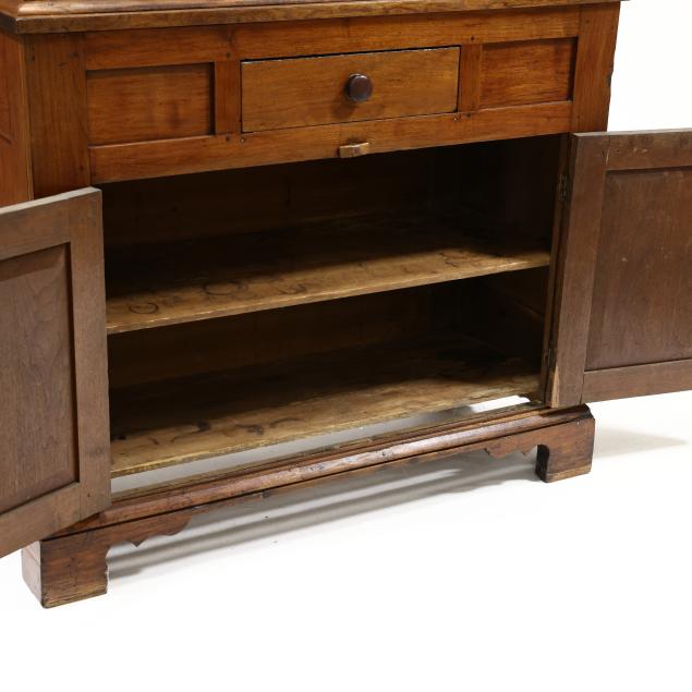 Attributed Rowan County, circa 1830, two part form, yellow pine secondary, applied flared cornice, two upper hinged cabinet doors with eight window lights each, molded mullions, shelved interior, the base featuring a high waist with central drawer flanked by two inset panels above two hinged paneled cabinet doors, shelved interior, bold shaped bracket foot base, upper and lower paneled case sides.