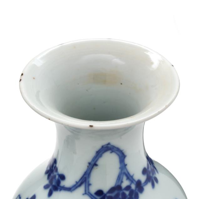 Possibly Kangxi period (1662-1722), porcelain hand painted in underglaze blue with lush blooming flowers and delicate birds, one vase with double blue circles to underside and the other with a four character Kangxi mark.