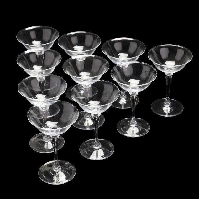 New York, a mid 20th century production, (38) pieces after the earlier Frederick Carder design including (10) water goblets (8 in.); (11) cordials (6.5 in.); (7) wines (7 in.); and (10) champagne coupes (5.75 in.), signed.