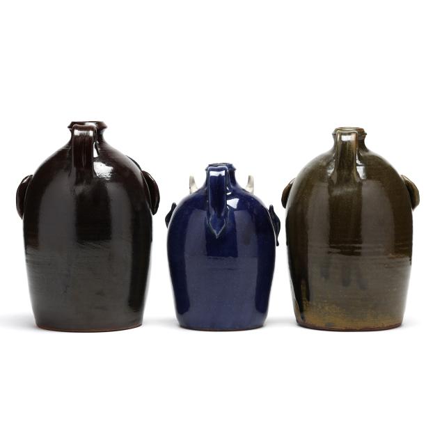 20th century, glazed earthenware, two are similar with 'bullseye' applied eyes, straight nose, combed eyebrows and mustache, open mouth (10 in. and 11 in.), the third is a blue glazed devil (8 1/2 in.), all inscribed on the underside by the potter.