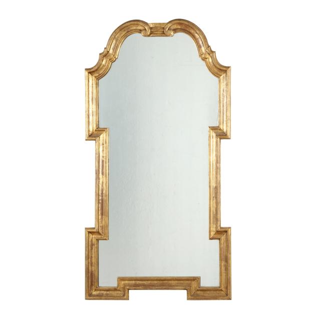 20th century, a mirrored glass within a giltwood frame featuring a broken scrolled pediment over a uniquely shaped rectangular surround, not labeled.