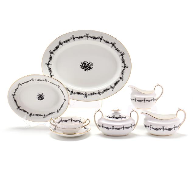 England, 20th century, (82) pieces, including (12) dinner plates (10 1/2 in. dia.); (12) salad plates (8 1/2 in. dia.); (12) bread plates (6 1/4 in. dia); (11) teacups and (11) saucers; (9) cream soup bowls and (10) saucers; a creamer; a lidded sugar bowl; gravy boat; a vegetable bowl; and a large serving platter (15 in.); all marked.