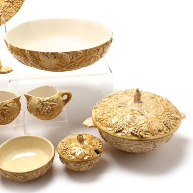Made in Italy, 1998-2021, now discontinued, (74) piece set, fired ceramic with Naples ochre glaze and embossed grape leaf motif, to include: (12) dinner plates (11 3/4 in.); (12) salad plates (8 in.); (12) rim soup bowls (10 in.); (12) coupe cereal bowls (6 in.); (12) mugs (4 in.); (2) creamers; (2) covered sugars; (3) round covered vegetable servers (9 1/4 in.); round vegetable bowl (9 1/4 in.); large round serving bowl (13 in.); large round serving tray/charger (15 in.); (4) oval serving trays (22 1/4 in.). Most signed to underside.