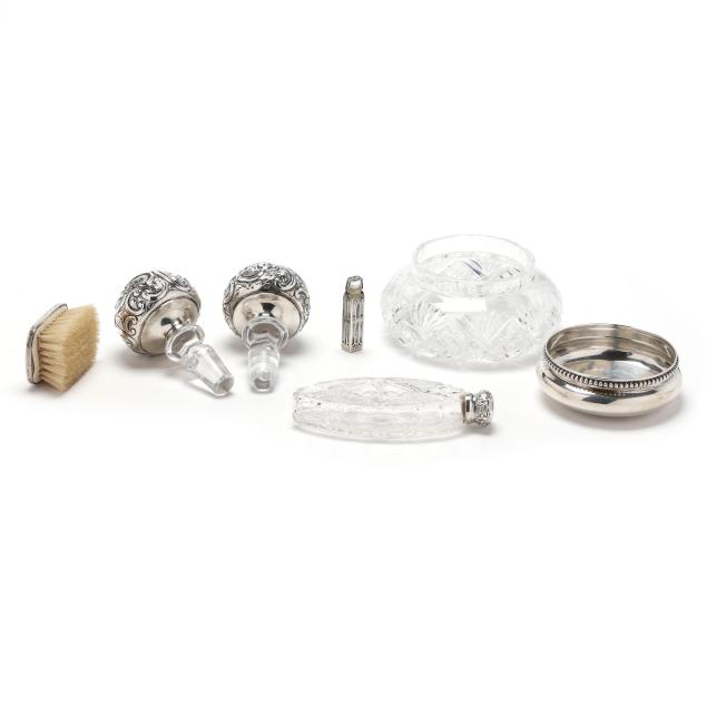 The first, a cut crystal dresser jar with sterling silver lid with mark of Shiebler, pattern number 7512, featuring a bead course decorated rim, with monogrammed lid (4 x 6 in. dia.); a sterling silver mounted crystal dressing bottle with mark of Simons Brothers, pattern number 870, with hand chased repousse mount, monogrammed lid (5 3/4 in.); a pair of Gorham sterling silver mounted crystal decanter stoppers, pattern number 04234A, with chased scrolled decoration, both monogrammed (5 in.); a small glass perfume bottle with reticulated silver case marked "sterling"; and a clothes brush marked "sterling", with a hammered surface, monogrammed.
