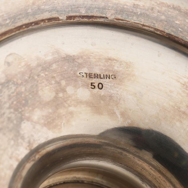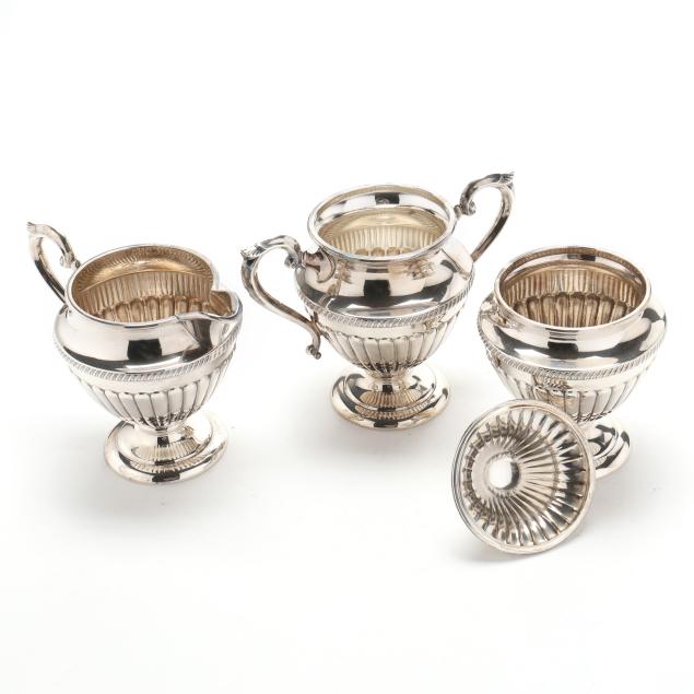 Pattern number 50, without a manufacturer's mark, includes a coffee pot (12 in.); teapot (10 1/2 in.); creamer, lidded sugar bowl, and waste bowl; the pieces featuring fluting to the bodies and lids and gadrooning to the shoulders, without monograms.