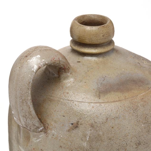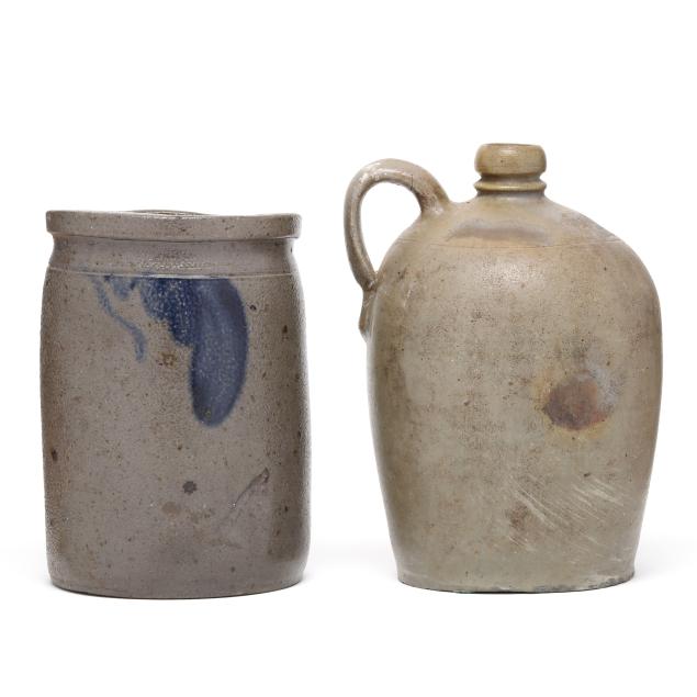 Both half gallon size, a stamped "J.M. HICKERSON STRASBURG" circa 1885, jar with two brushed cobalt swirls (7 3/4 in.) (rim nick, rim out-of-shape, original surface gouge); the second, ovoid in form, is stamped "B.C.MILBURN ALEXA" circa 1860, without decoration (9 in.) (hairline across the handle).