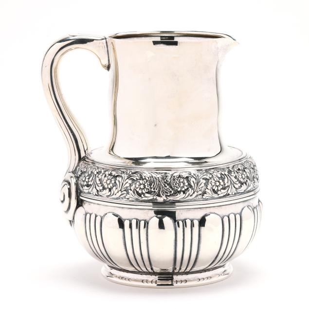 Circa 1873-1891 period hallmark, pattern number 6463, the waist featuring a band of acanthus leaf and rosette design, the belly with lobed decoration, the tall collar with undulating sides, the sinuous handle affixed to body with a double spiral mount, no monograms.