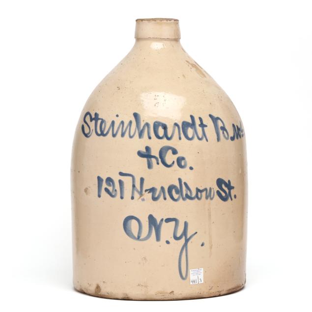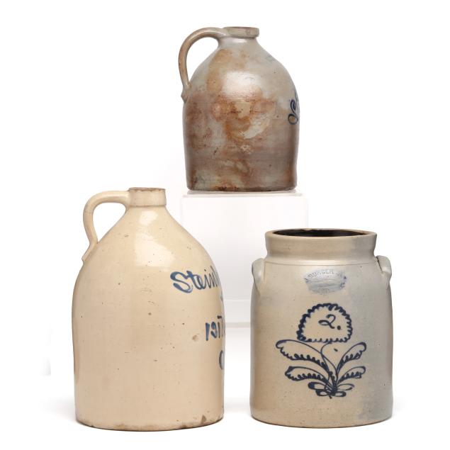 Late 19th century, a cobalt script decorated marked two gallon whiskey jug (14 in.) (chips to rim and hairline across the handle); a stamped two gallon crock "J.BURGER, JR CHESTER, NY" cobalt decorated with a large flower, the petals encircling the capacity 2 (inner ledge chip otherwise good) (11 in.); the third is stamped "WINTON & GREGG ELLENVILLE NY," a one gallon size with stylized slip-trailed cobalt blossom (chip to the flat rim; some staining) (10 1/4 in.).