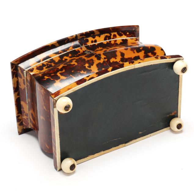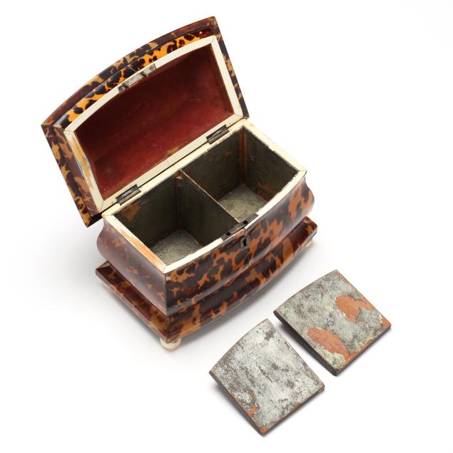 England, first quarter 19th century, pagoda form with silver stringing, vacant silver cartouche and escutcheon, opens to lidded twin compartments retaining much of likely original tin lining; raised on ball feet.