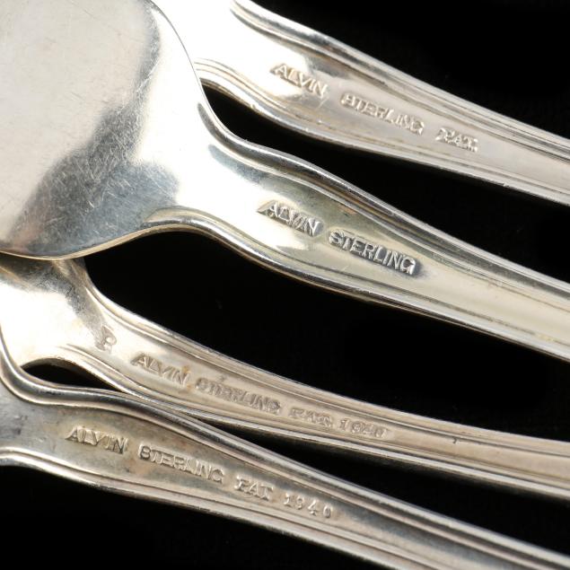 (71) pieces to include: (12) dinner knives (8 7/8 in.); (12) forks (7 1/4 in.); (11) salad forks (6 1/2 in.); (9) teaspoons (6 in.); (11) round bowl soup spoons; (8) iced tea spoons; (2) butter spreaders; (2) cream ladles; a gravy ladle; a sugar spoon; and a cold meat serving fork. This lot also includes a Reed & Barton sterling silver pickle fork. The service presented in a fitted flatware box.