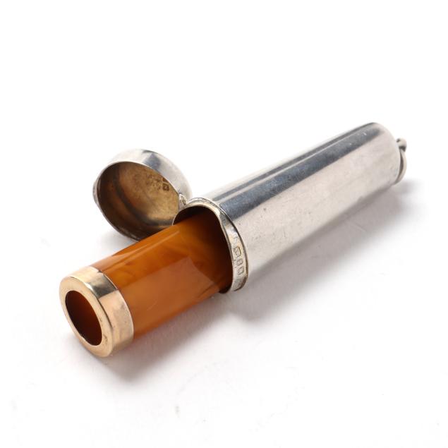 The first, a cigarette case with a built-in lighter marked "Made in England" with Dublin import marks circa 1906-1998 and "LH" maker's mark; and a Victorian silver cheroot holder, mark of Deakin & Francis Ltd, Birmingham (1899), with a cheroot, without a monogram.