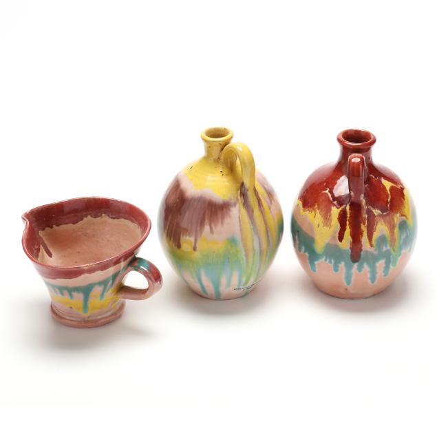 (11) pieces, 1930s, attributed to C.C. Cole or Thurston Cole, the glaze was achieved by dripping multi-colored glaze bands over a white lead glaze body, sometimes adding an overglaze for depth. The pair of 4-finger vases and the candle holders are stamped "WILLIAMSBURG HANDMADE POTERY".
