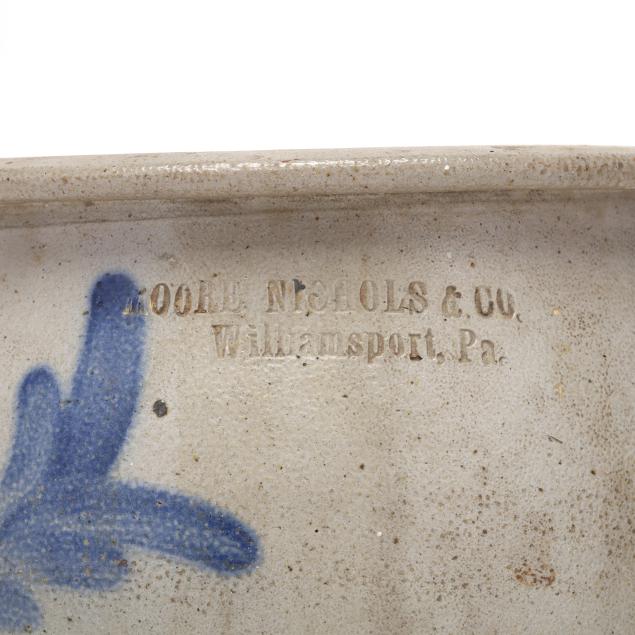 Salt glazed stoneware, the first, stamped SIPE & SONS / W'MSPORT PA," circa 1885, ovoid, cobalt leaves brush-decorated (tight hairlines from the base); the second, stamped "MOORE, NICHOLS & CO. / WILLIAMSPORT, PA," circa 1877-1879, with cobalt brush decorated semi-wreath (original impression above the foot; some staining).