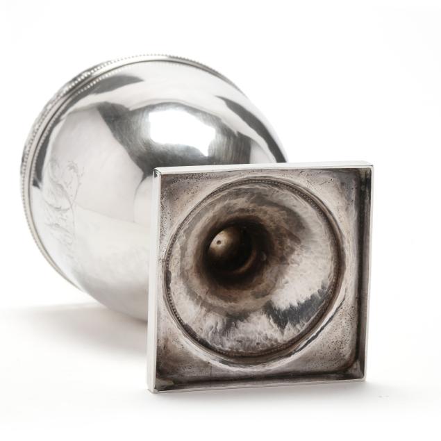 Philadelphia, late 18th century, goblet form with open-work gallery and narrow bead decoration, pull-off cover with urn finial, over a square base, with period script MP monogram.