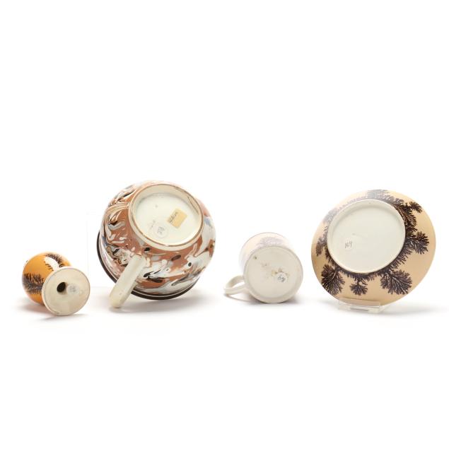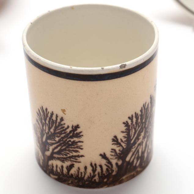 English, circa 1820-40, a cup with swirl decoration below two brown rings (2 3/4 n.) (firing line to the underside), a shaker decorated with a black dendrite tree (break and repair to the shaker top; small underside chip) (3 1/2 in.), a cup and saucer, tan with in-the-round tree and shrubbery decoration (cup 2 1/2 in.) (tiny rim flakes), not signed.