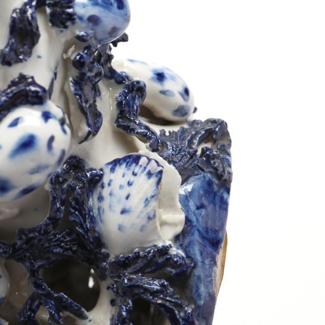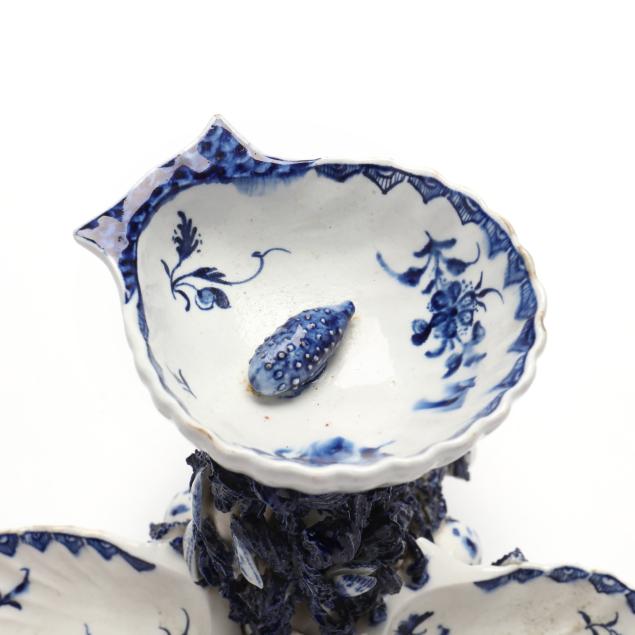 English, probably London, circa 1775, tin glazed earthenware, three dishes, highlighted with blue rims and floral centers, surround a single dish which is supported by a column encrusted with molded 'seaweed' decoration and small shells, not signed