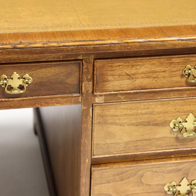 Top leather surface with indents and some finish wear; some small veneer chips to top edge; the all-drawer side with wear from use; sun fading.