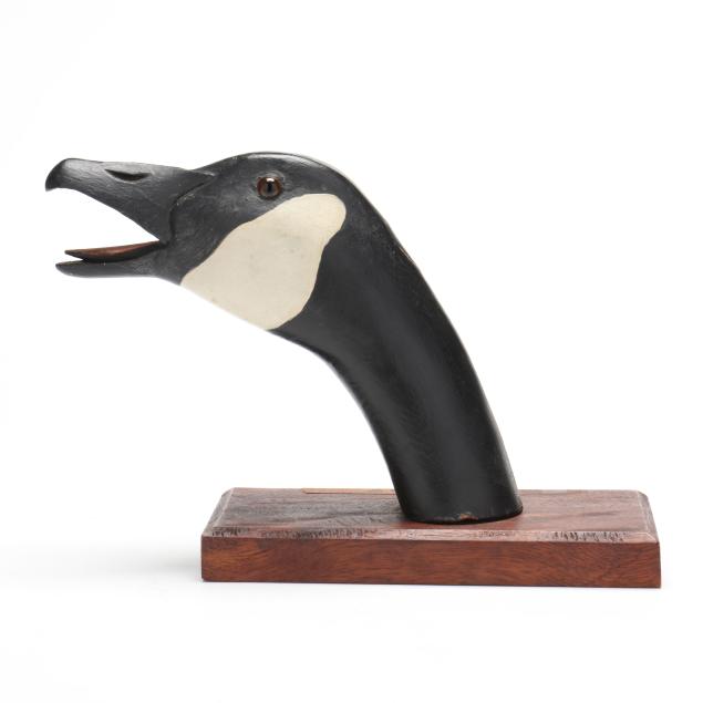 Crisfield, Maryland, circa 1964, carved and painted wood, glass eyes, mounted by dowel rod to wooden base marked CANADA GOOSE / MADE BY LEM WARD / CRISFIELD, MD.